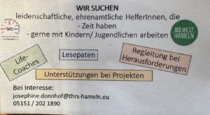 Im Rahmen des 7. Hamelner Seniorenforums haben sich Schülerinnen und Schüler der IGS West und der Theodor Heuss Realschule mit dem Thema „Generationen helfen Generationen“ beschäftigt und sich auf die Suche nach ehrenamtlichen Seniorinnen und Senioren gemacht, die unsere Schulen vielfältig unterstützen können und so das Lern- und Lebensgefühl unserer Schulgemeinschaft bereichern.